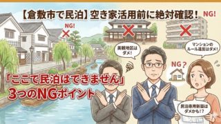 各種許認可 【倉敷市で民泊】空き家活用前に絶対確認!「ここで民泊はできません」3つのNGポイント 倉敷市で民泊(住宅宿泊事業)を始めたい方必見!行政書士やまもと事務所が、美観地区の制限やマンション規約など、計画段階でつまずきやすい「3つのNGポイント」を分かりやすく解説。あなたの物件で民泊ができるか分かる「無料チェックシミュレーター」も公開中です! 2026.03.27 各種許認可未分類