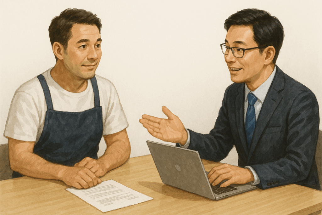 「まずよろず支援拠点で方向性を相談 → 実際の手続きや書類作成は行政書士など専門家に依頼」