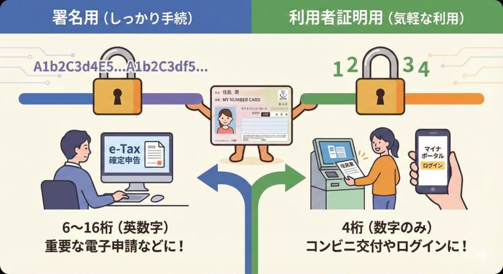 マイナンバーカードには、主に次の2つの暗証番号があります。