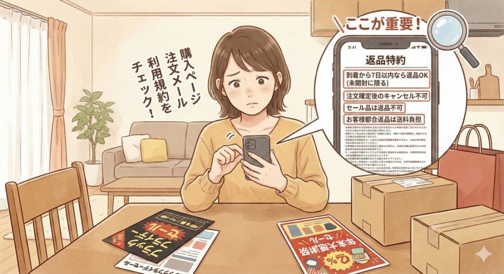 もし返品ルールの記載が分かりにくい/見当たらない場合は、ケースによっては「返品できる可能性」が出ます。
