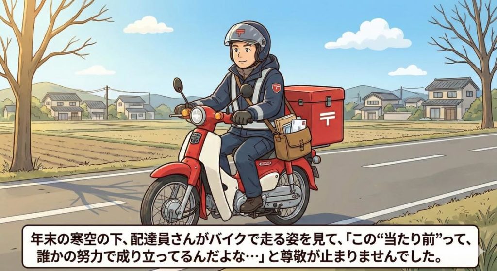 年末の寒空の下、配達員さんがバイクで走る姿を見て、「この“当たり前”って、誰かの努力で成り立ってるんだよな…」と尊敬が止まりませんでした。