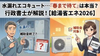 業務日誌 水漏れするエコキュート…「補助金ないから春まで待て」は本当?行政書士が自宅の危機で検証した結果【給湯省エネ2026】 15年目のエコキュートが水漏れ。「今年度の補助金は終了だから春まで待て」は本当?実は2025年11月28日以降なら新補助金の対象です!工事を待たずに給湯省エネ2026事業を活用する方法、ネット接続などの新要件、行政書士の実体験を解説します。 2025.12.14 業務日誌補助金