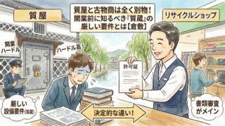 各種許認可 「リサイクルショップ」と「質屋」って何が違うの?開業前に知っておきたい“ハードルの差”をやさしく解説 質屋とリサイクルショップ(古物商)の違いを、契約の中身からやさしく解説。開業時に必要な許可、準備のポイント、質屋の設備ハードルも比較。倉敷で開業相談も受付中。 2026.01.09 各種許認可