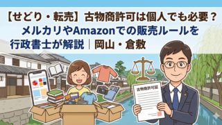 各種許認可 【古物商許可 個人】せどり・転売・メルカリ・Amazonを始める前に読む話(倉敷の行政書士がやさしく解説) 個人でAmazonやメルカリ等のせどり・転売を始める方へ。古物商許可は「バレない」では済まされません!必要なケースと不要なケース、実際に許可を取っている個人の事例(岡山県警・高知県警データ)を行政書士がわかりやすく解説します。 2026.02.05 各種許認可