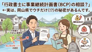補助金 行政書士に事業継続計画書(BCP)の相談?――実は、岡山県でウチだけ(!?)の秘密があるんです 災害・停電など“もしも”に備えるBCP(事業継続計画書)を、倉敷市の行政書士が分かりやすく支援。事業継続力強化計画の認定取得経験を活かし、申請・作成をサポートします。 2026.03.10 補助金