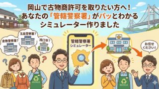 各種許認可 岡山で古物商許可を取りたい方へ!あなたの「管轄警察署」がパッとわかるシミュレーター作りました 岡山で古物商許可を申請するなら「管轄警察署」の確認が必須。倉敷・水島・児島・玉島、浅口市や里庄町の注意点も解説。管轄がすぐ分かる検索シミュレーターも紹介。 2026.03.28 各種許認可