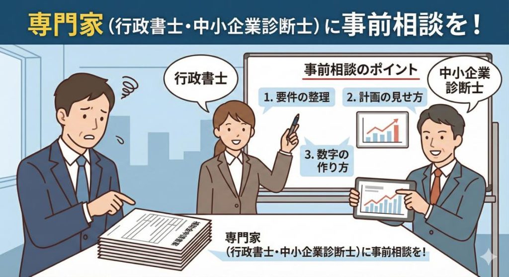 • 専門家に事前相談する(要件の整理、計画の見せ方、数字の作り方)
