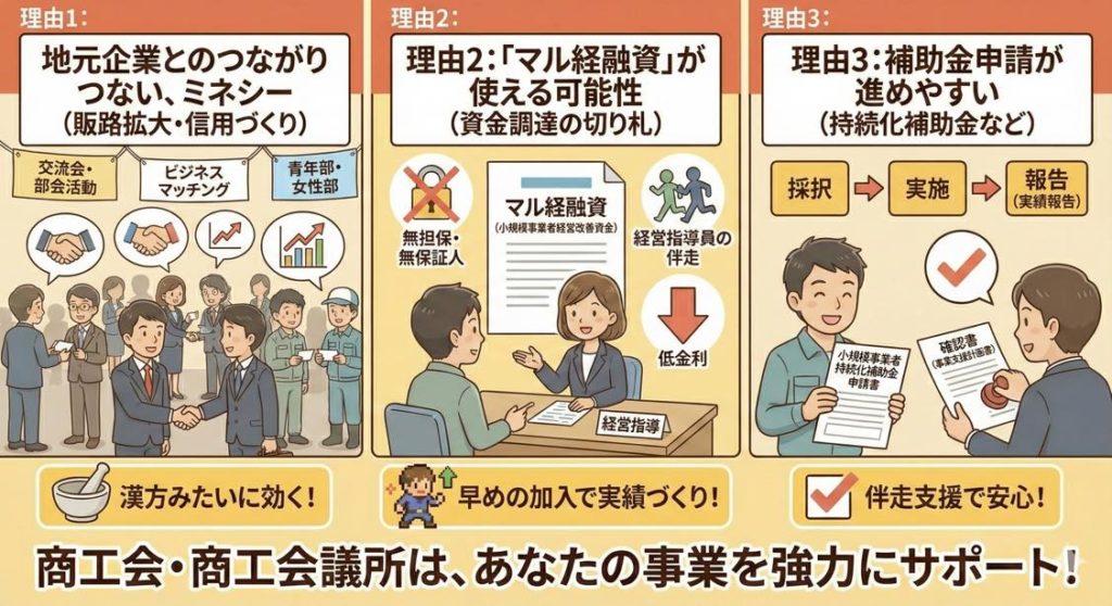 商工会や商工会議所と聞くと「付き合いで入るもの」と思われがちですが、実利が大きいメリットは次の3つです。