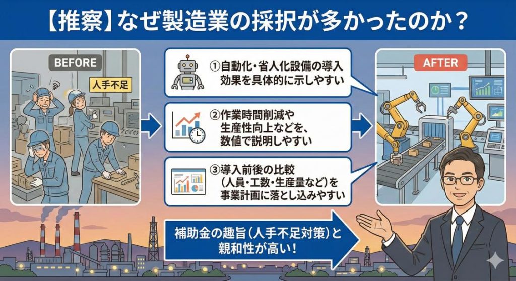本補助金の内容を見ると、製造業は特に次の点で評価されやすかった可能性があります。