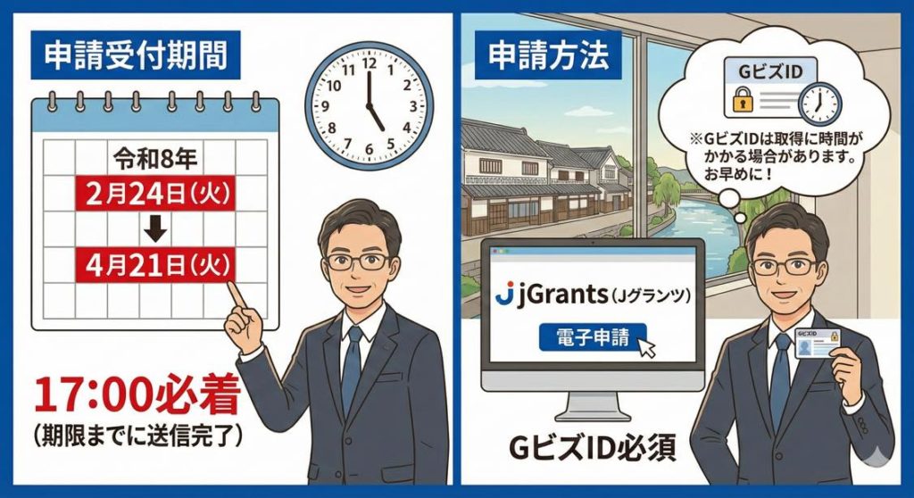 (2026年1月24日現在)本補助金は、申請受付開始まで約1か月、申請締切まで約3か月あります。