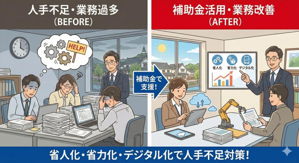 「人を増やす」のが難しい時代だからこそ、少ない人数でも業務が回る仕組みづくり(設備投資・業務改善)に活用できる補助金。