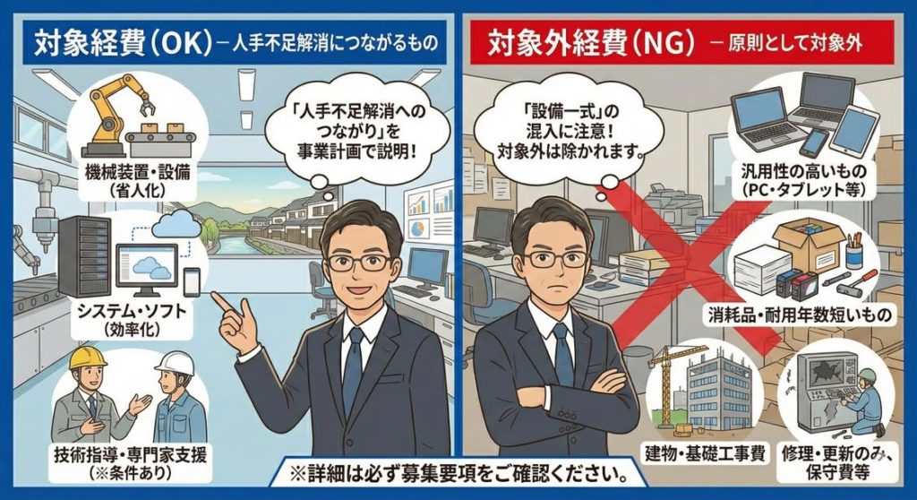 いずれも、「人手不足の解消にどうつながるのか」を事業計画上で説明できることが重要になります。
