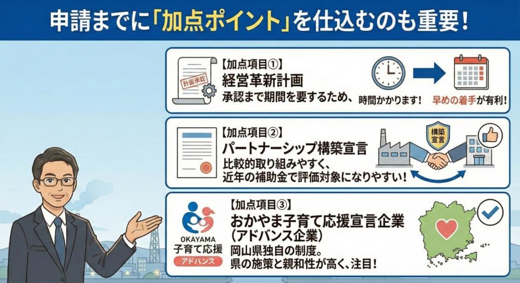 こうしたタイミングだからこそ、事業計画を作るだけでなく、加点要素の準備も並行して進めることが重要になります。