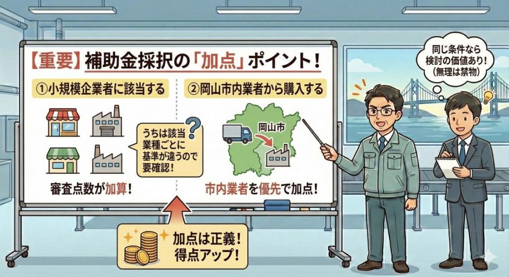 とはいえ、制度は岡山市の補助金ですので、要件に沿って“取れる加点”を確実に拾っていきましょう。