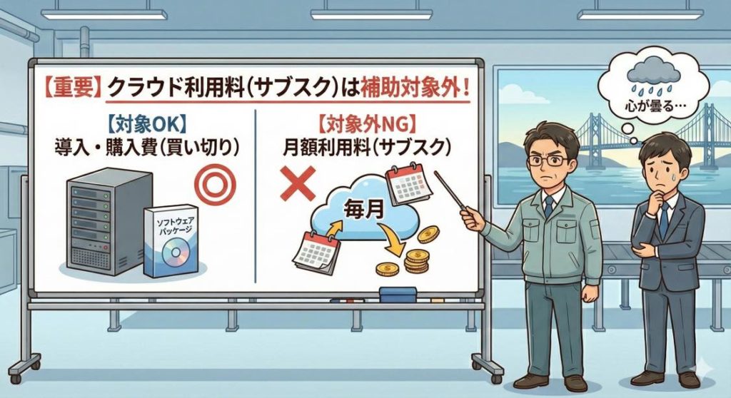 そのため、設備やシステムを検討するときは、「購入(導入費)は対象になるけど、月額利用料は対象外」というケースがあり得ます。