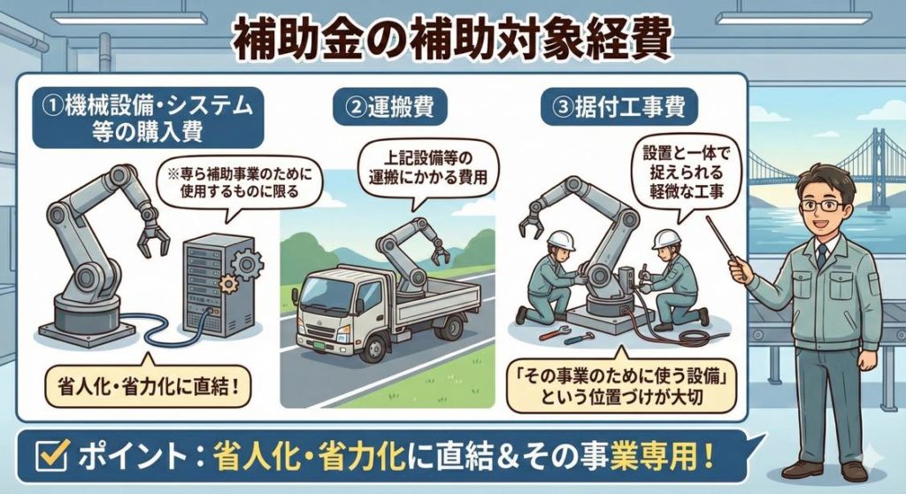 ポイントは「誰が見てもその設備が“省人化・省力化のための専用設備”と言えるか?」が分かれ目になります。