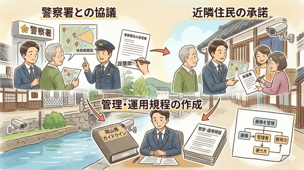 - 警察署との協議: 所轄の警察署に相談し、設置場所や撮影範囲について専門的なアドバイスを受けた上で「警察署長の意見書」をもらう必要があります 。