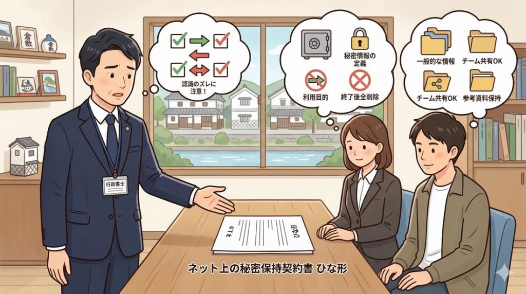 例えば、秘密を渡す側は、「利用目的が広すぎないか」「目的外利用を防げるか」「契約終了後も情報が残らないか」などといった点が気になります。