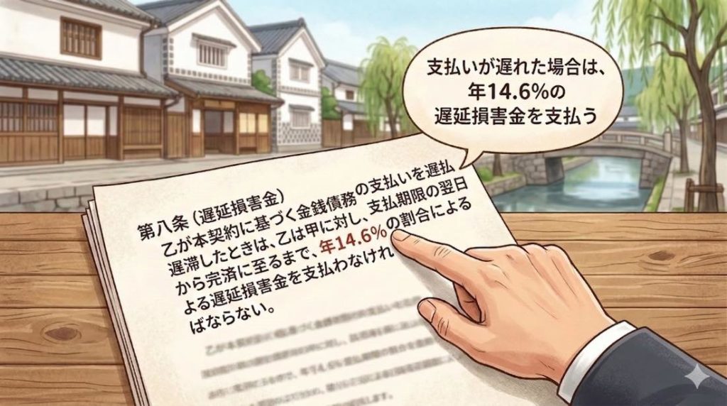 支払いが遅れた場合は、年14.6%の遅延損害金を支払う