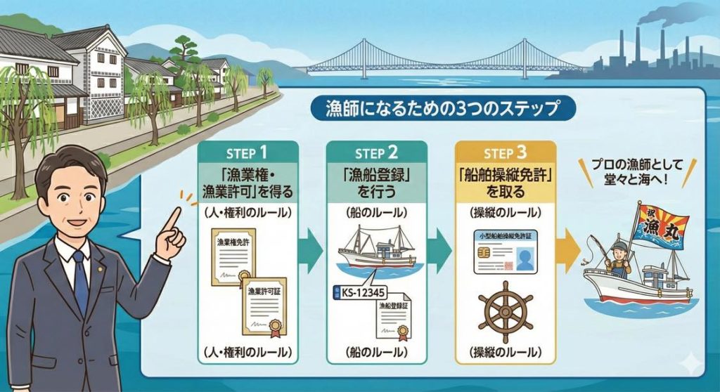 結論:漁師になるには「許可」と「登録」と「免許」のセットが必要!