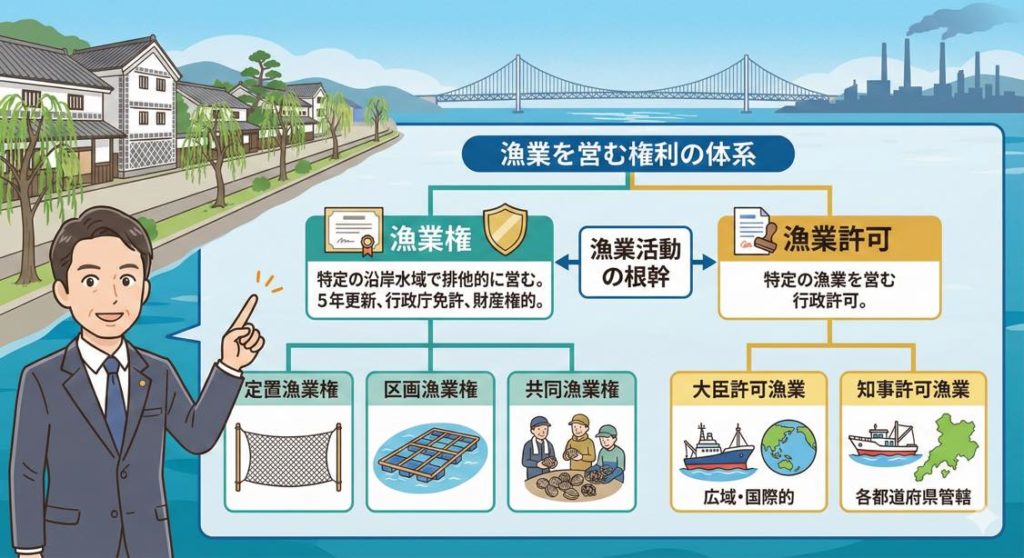 - 許可制の漁業: 沖合での大きな漁などは、知事や大臣からの特別な「許可」が必要です。(漁業許可)