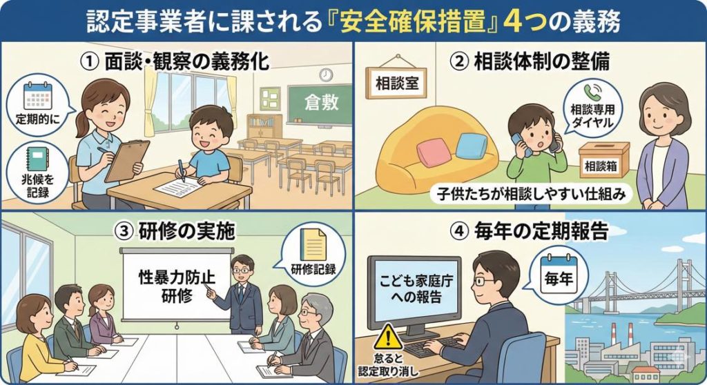 認定事業者には、犯歴確認以外にも「安全確保措置」と呼ばれる多くの義務が課されます。