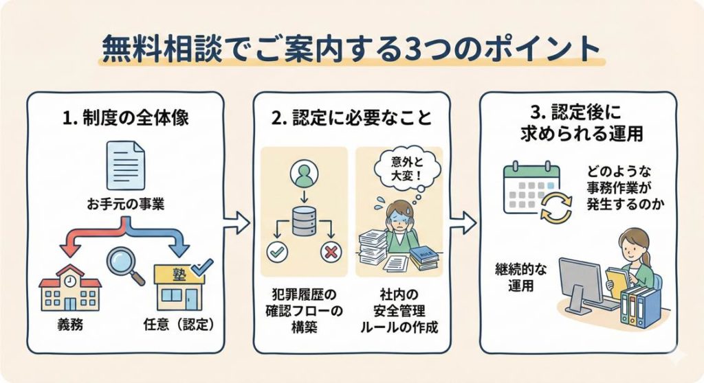 そこで当事務所では、日本版DBSについて不安や疑問をお持ちの事業者様向けに、無料相談窓口を開設いたしました。