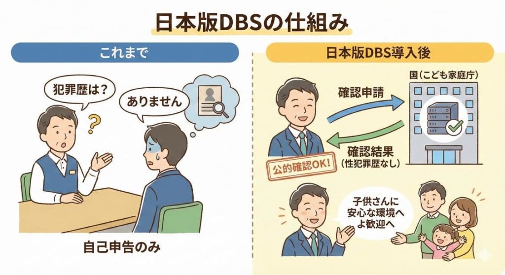 日本版DBSを一言でいうと、子どもに関わる仕事に就く人が、過去に性犯罪を起こしていないかを公的に確認できる制度です。