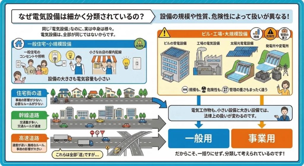 なぜ、同じ“電気設備”なのに、「一般用」「事業用」「自家用」「小規模事業用」と、こんなに細かく分かれているのでしょうか。