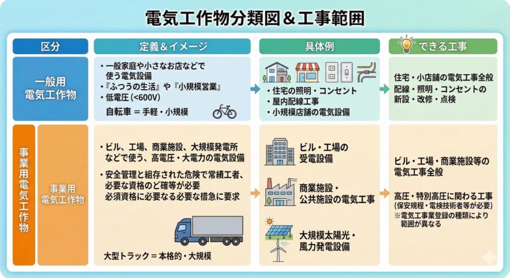 要するに、「ふつうの生活や小規模な営業で使う電気設備」と考えると、大きくズレません。