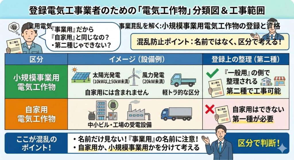 ここを逆に言うと、第二種電気工事士の方が「事業用」という言葉だけを見てしまうと、必要以上に混乱しやすいわけです。