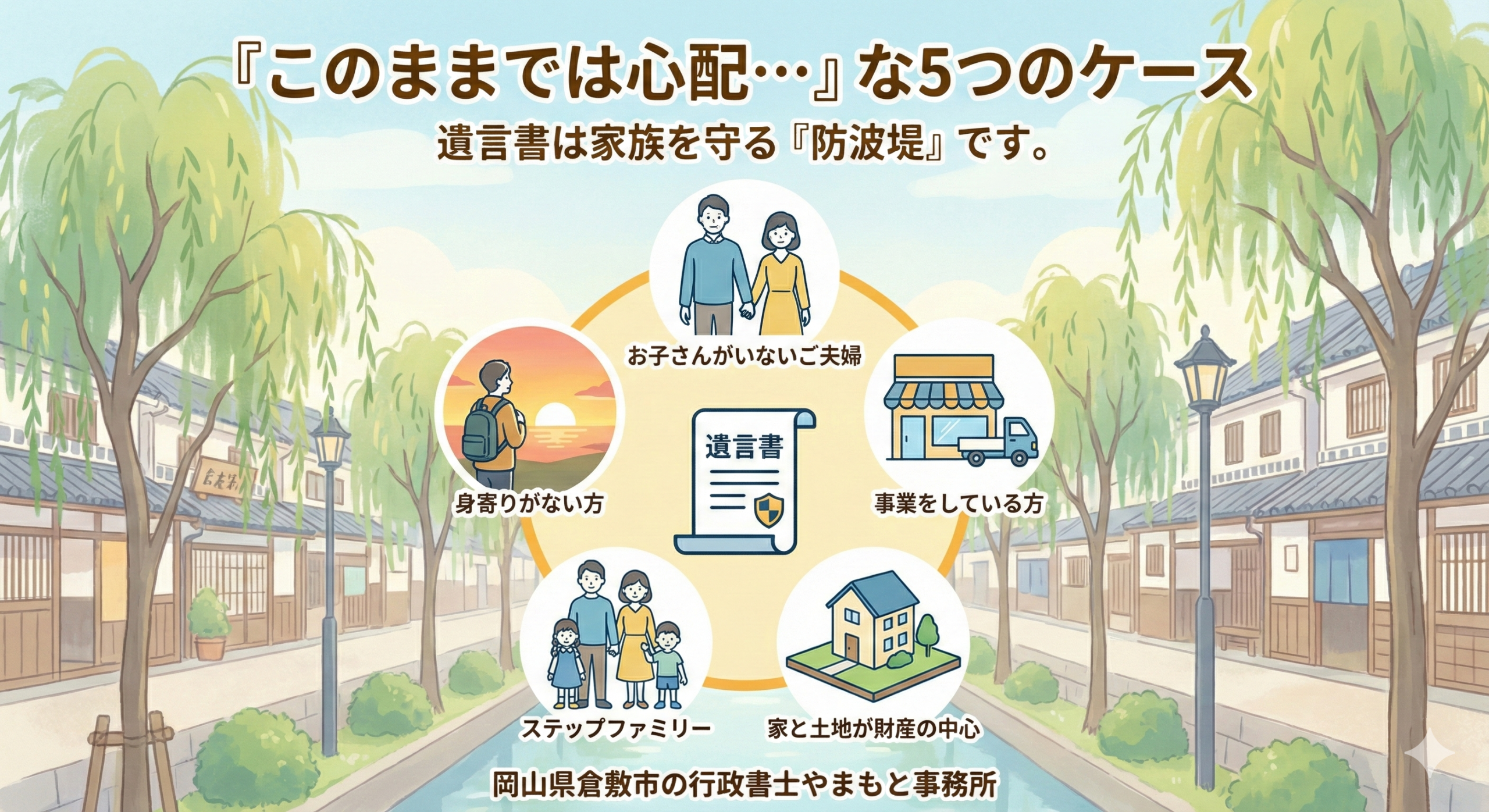当事務所では、倉敷市を中心に、岡山市・総社市・浅口市の皆さまから、遺言書作成のご相談を承っています。