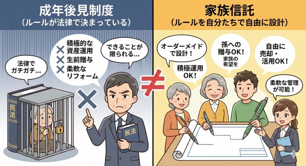一方で、家族信託は「ルールを自分たちで自由に決められる」のが最大の特徴であり、メリットです。