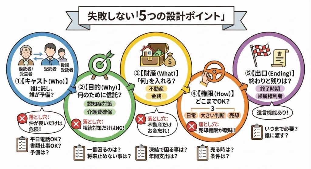 「5W1H(誰が・なぜ・何を・どうやって・いつまで)」 これを決めるのが、家族信託の設計です。
