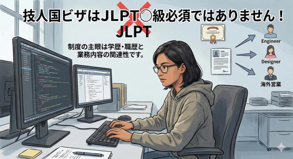 • 技人国は原則、JLPTの級が制度要件ではない(ただし職務上の必要性は別問題)。